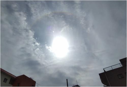 本来は上空の高い所にある氷の粒(氷晶)が太陽光を屈折させることで、円状の明るい光として見える現象だそうです。